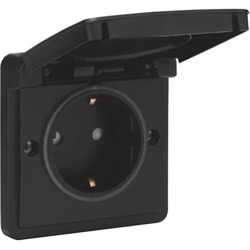 Spuitwaterdicht opbouwstopcontact 16 A/250 Vac met randaarde, beschermingsafsluiters en met insteekklemmen, exclusief opbouwdoos, black. Beschermklep: Elk stopcontact wordt volledig bedekt door een naar boven scharnierende beschermklep. Een veer en een bevestigingshaakje houden de beschermklep stevig dicht.